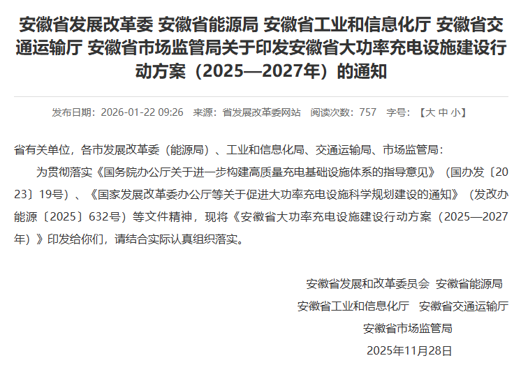 安徽省正快速推进大功率充电设施建设。近期发布的《安徽省大功率充电设施建设行动方案(2025—2027年)》明确提出,到2027年,将构建覆盖广泛的“四区一廊一线”大功率充电网络,单枪功率需达250千瓦以上。