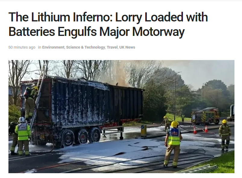 据外媒报道,英国:锂电池货运车高速起火事发时,车辆处于高速行驶状态,火情突发后驾驶员紧急停车疏散,现场浓烟滚滚、火光冲天,高温导致周边交通临时管制。由于锂电池热失控具有燃烧速度快、温度高、易复燃、可能引发爆炸的特点,常规消防处置手段难以快速阻断火势,救援人员需耗费大量时间压制火情、防范复燃,此次事件虽未造成人员伤亡,但也暴露了锂电池货运场景的消防防护短板。