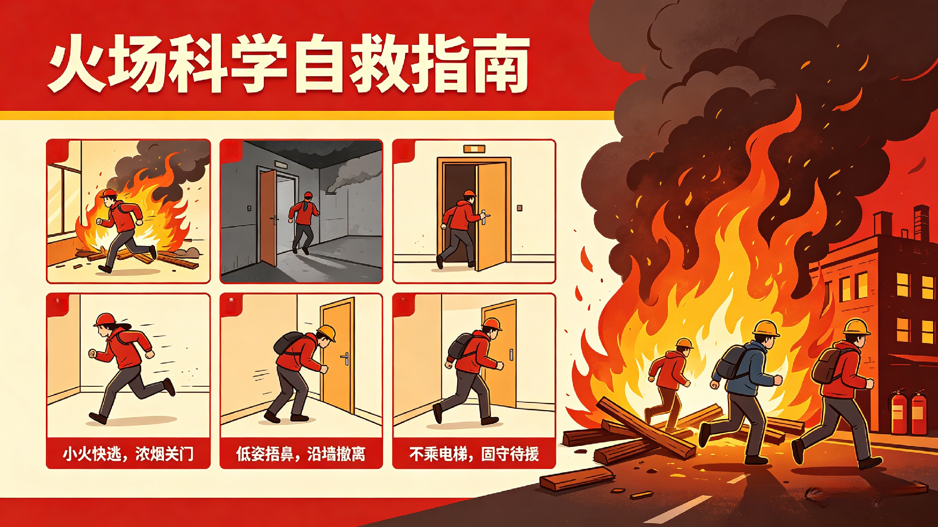 核心口诀:小火快逃,浓烟关门;低姿捂鼻,沿墙撤离;不乘电梯,固守待援。