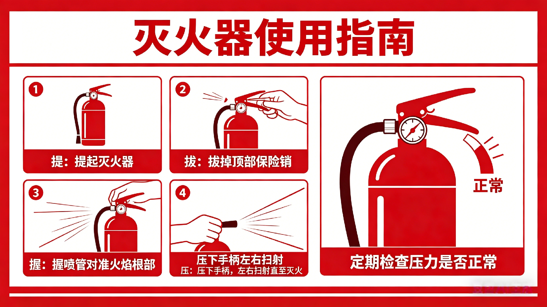1. 提:提起灭火器;2. 拔:拔掉顶部保险销;3. 握:握喷管对准火焰根部;4. 压:压下手柄,左右扫射直至灭火。