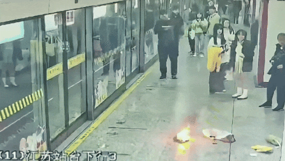 4月18日 早上,11号线江苏路站: 相隔不到两天,一名女乘客的随身包袋突然起火。监控显示,火势迅速窜起,所幸她反应快,倒出物品扑灭了火。事后她坦言,这个充电宝是向同学借的,对品牌和容量是否合规“不清楚”。