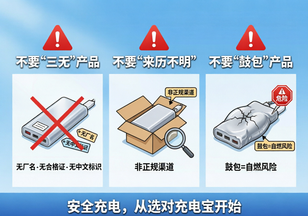 不要“三无”产品: 那些在展会上、地摊上、甚至是网购里几十块钱甚至更便宜的“白牌”充电宝,千万别买。案例中的男士就是因为用了展会上的赠品才酿成险情。