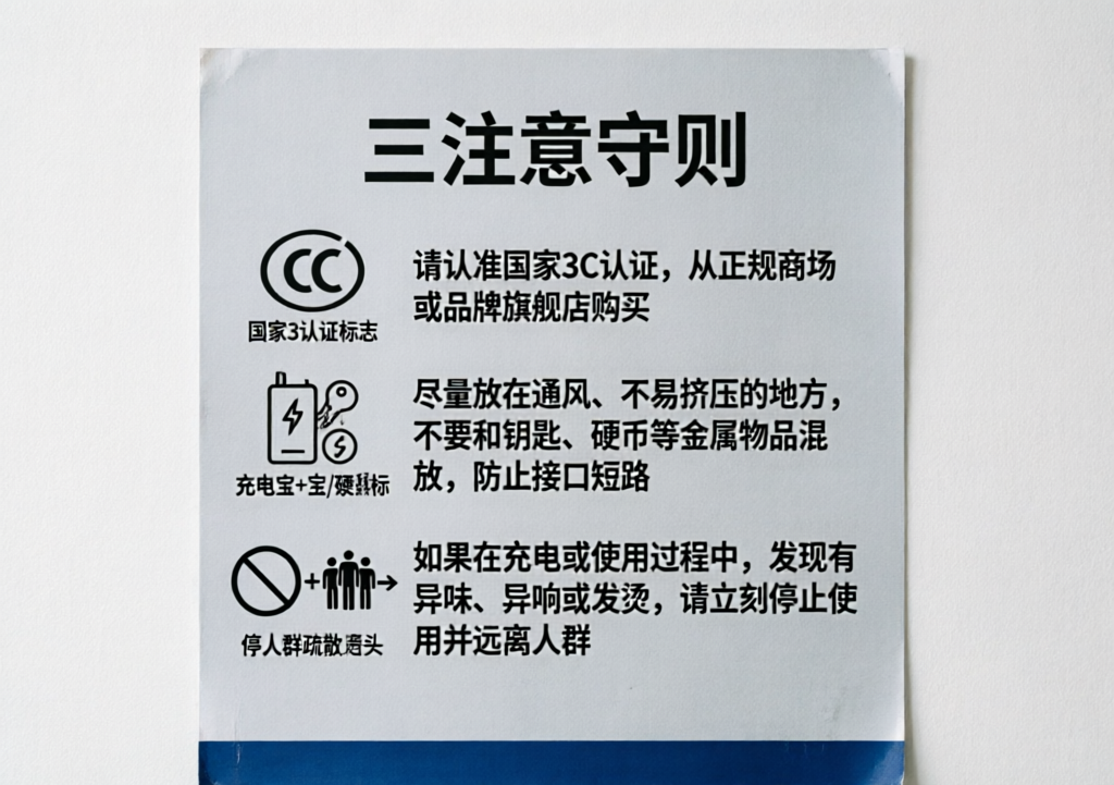异常立刻停: 如果在充电或使用过程中,发现有异味、异响或发烫,请立刻停止使用并远离人群。