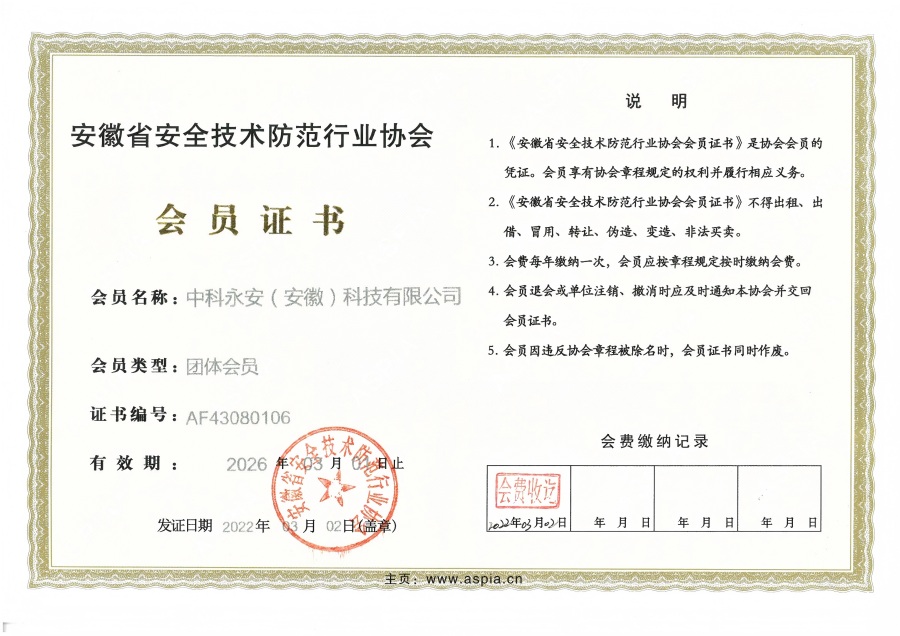 安徽省安全技术防范行业协会会员证书
